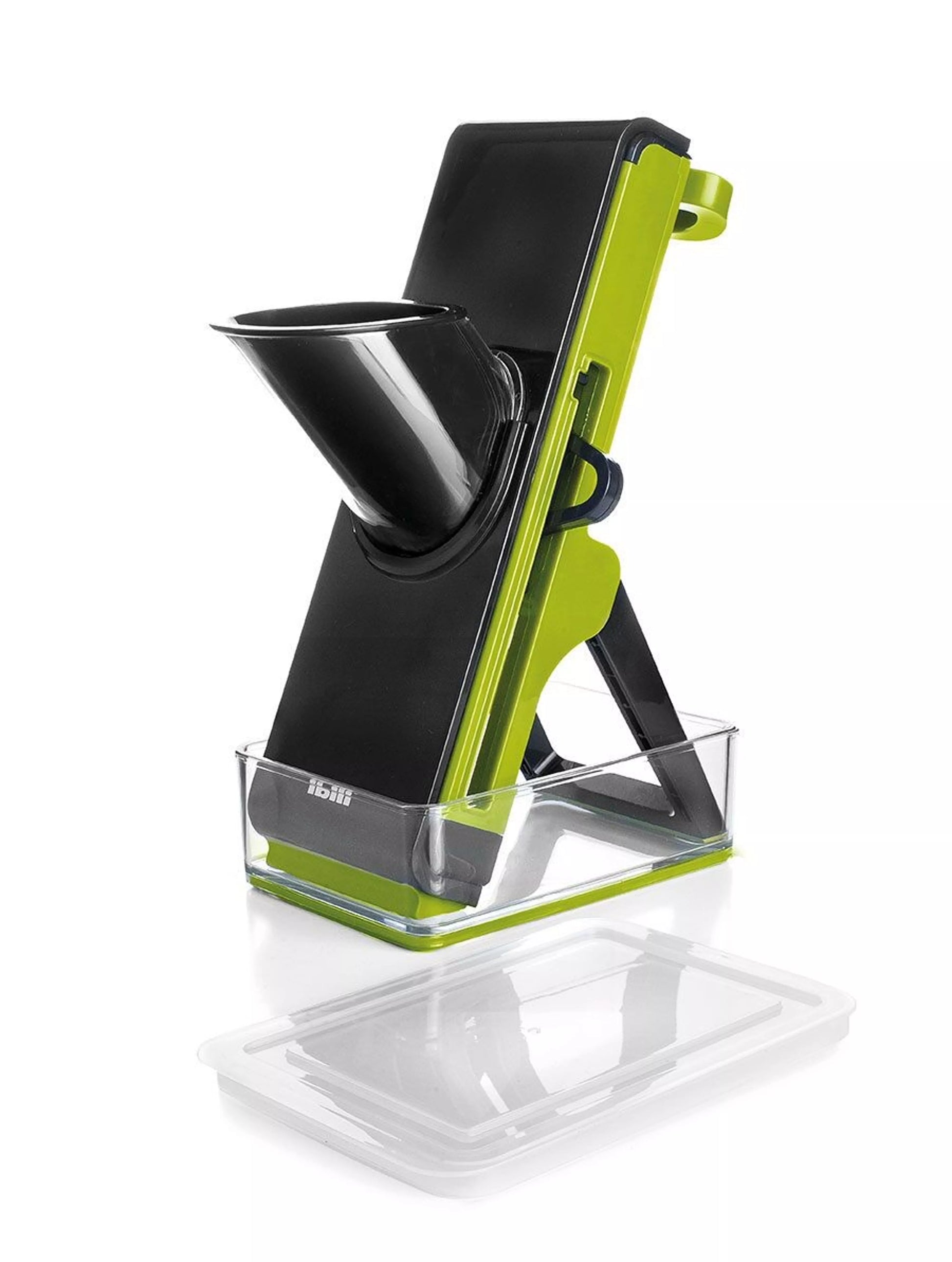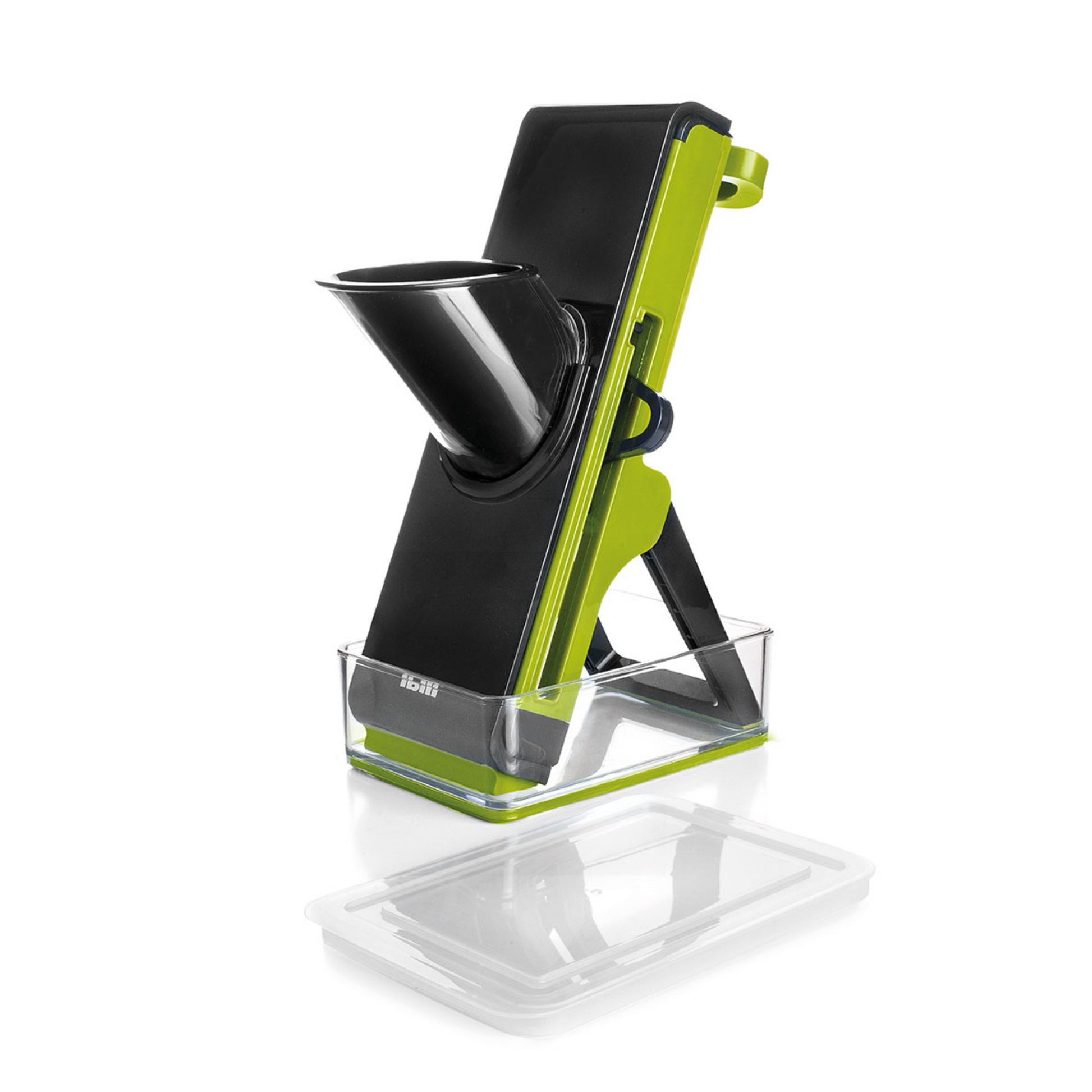 Mandolinjernet er udstyret med en foldbar bipod-støtte, der giver stabilitet under brug. Den integrerede madbeholder fanger de færdige grøntsagsstykker og gør det nemt at opbevare dem.